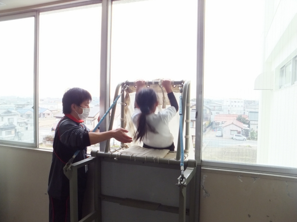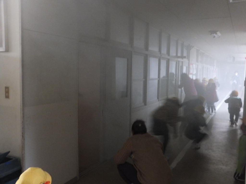 煙で何もみえず、怖さを実感! いざというときもこれで対応できそう! 勇気をもって救助袋へ!