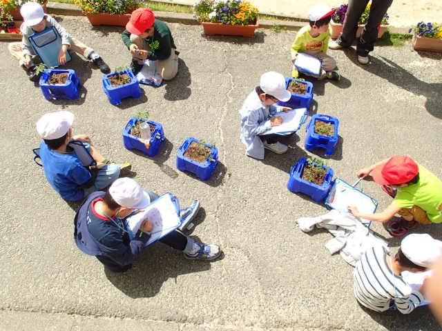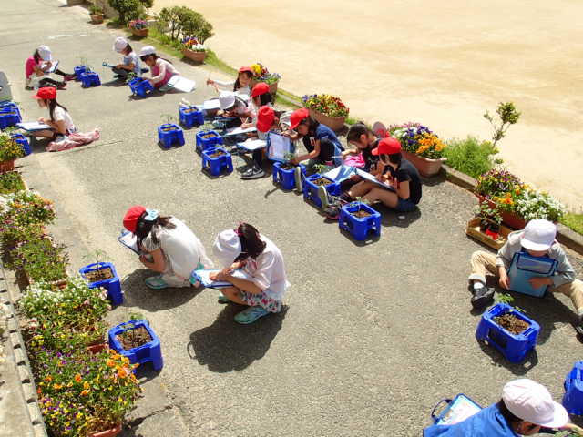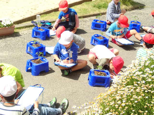 5月のさわやかな青空のもと、2年生がミニトマトの観察を行いました。
