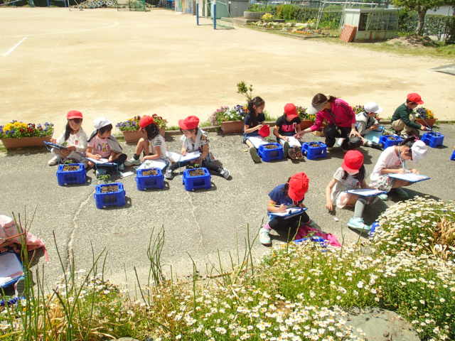 葉や茎をさわったり、のぞき込んだりして観察し、描いていました。
