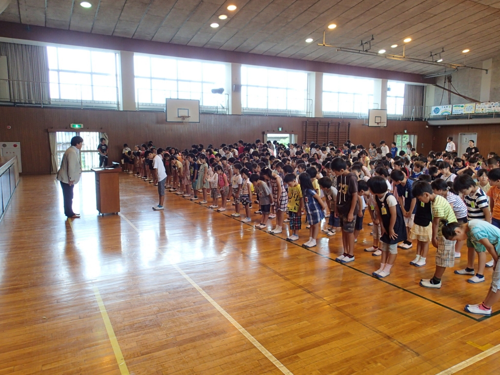 朝礼では、校長先生から「登下校中に雷が鳴ったときは、登校を見合わせたり、近くの建物に身を寄せるなど避難しましょう」との話がありました。