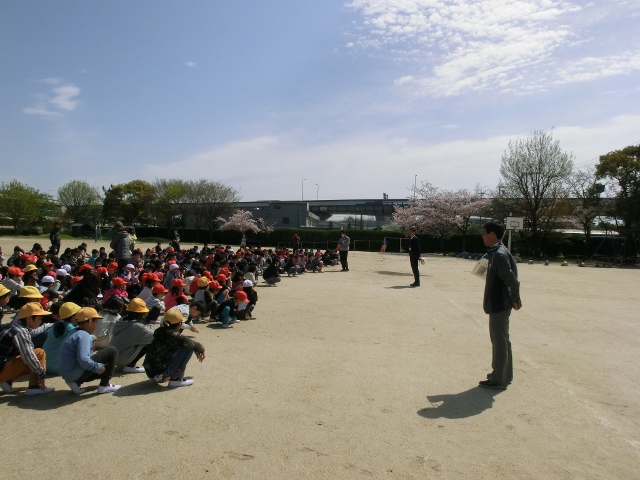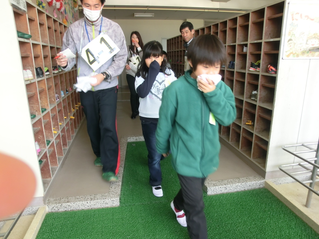 緊急放送の後、運動場へ避難をしました。運動場に本部が設置される前に、1年生は運動場に出て並び始めました。その後も担任の先生を先頭に、素早く避難行動をとることができました。ハンカチを口に当てる姿が印象的でした。新しい教室から新しい仲間と避難する経路の確認ができました。