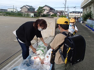 PTAの厚生部さんによる牛乳パック・アルミ缶回収が始まりました。袋を手に登校する子どもたちから受け取って、委員さんが仕分けをしながら袋に詰めます。