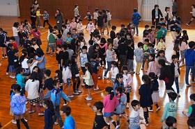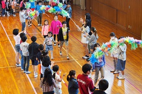 6年生が1年生の手を引いて入場し、全校でクイズやジャンケン列車をして遊びました。