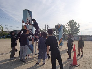 子どもたちが帰った後、先生たちで入場門を立てました。