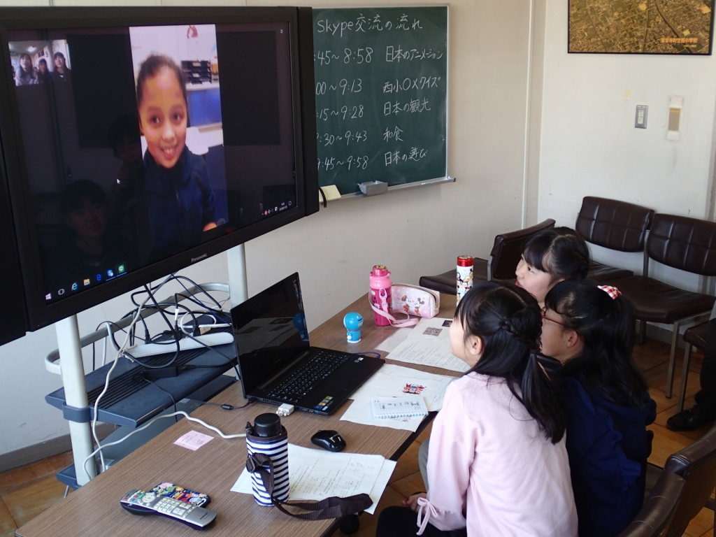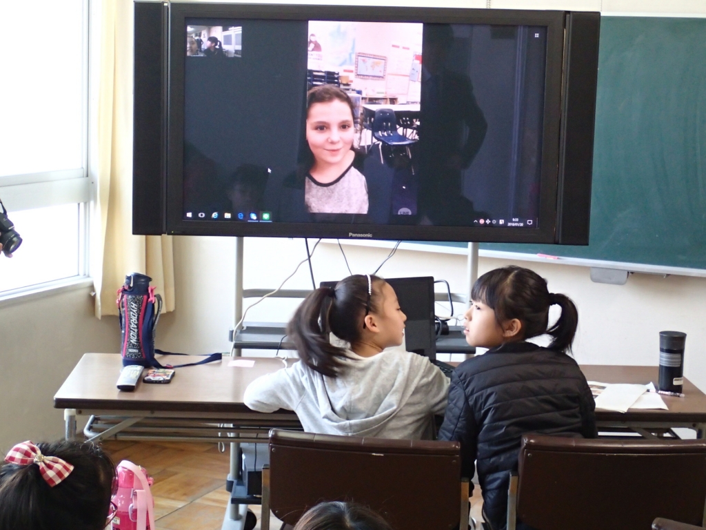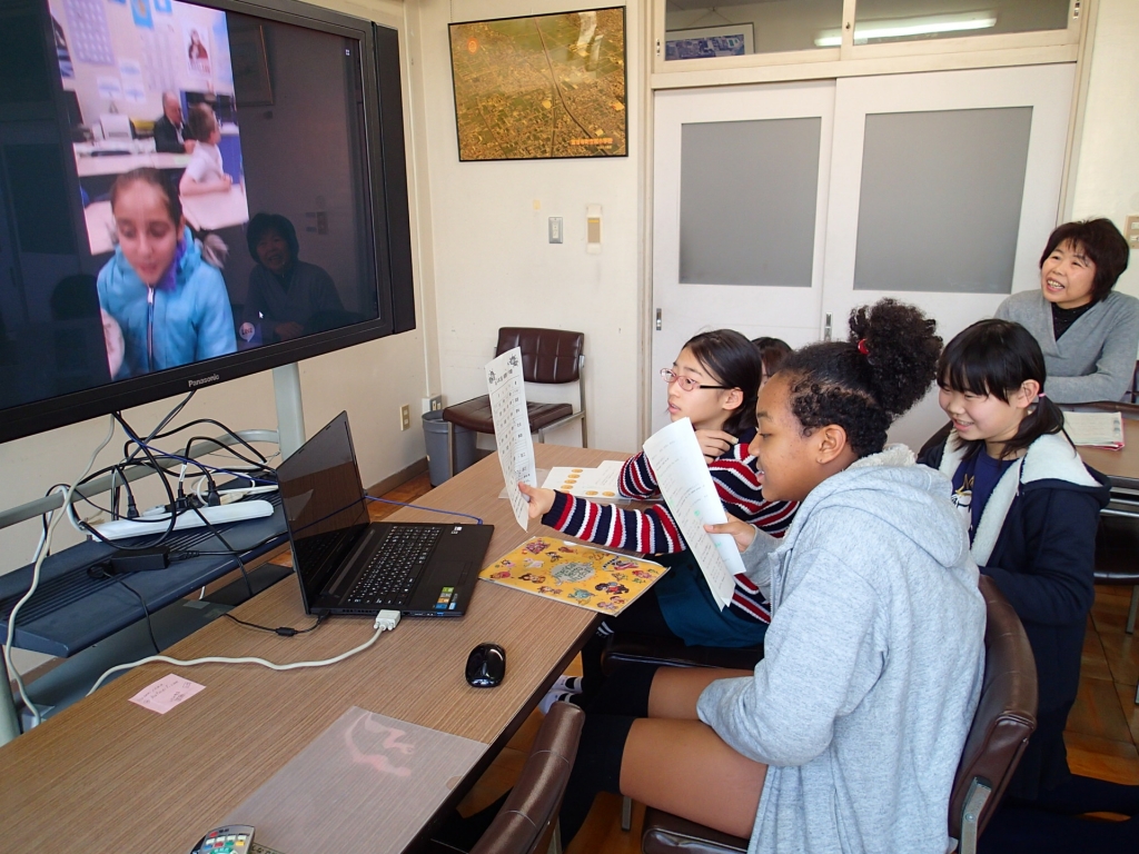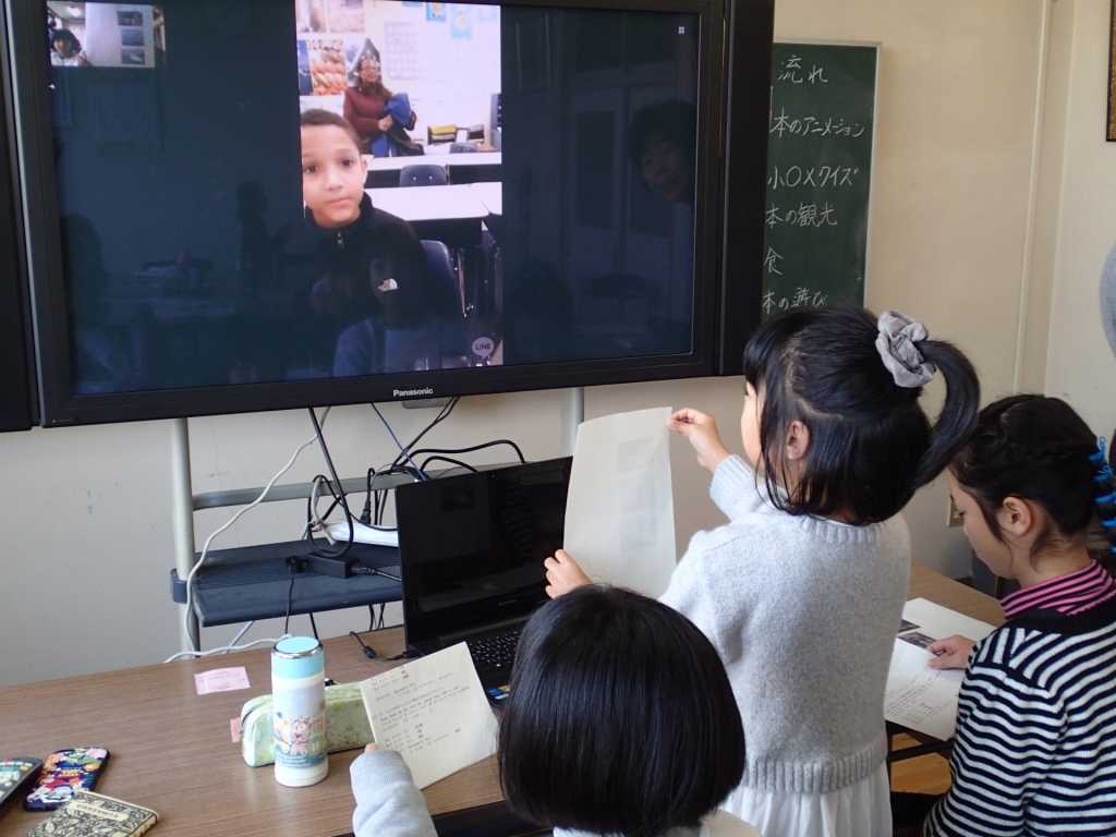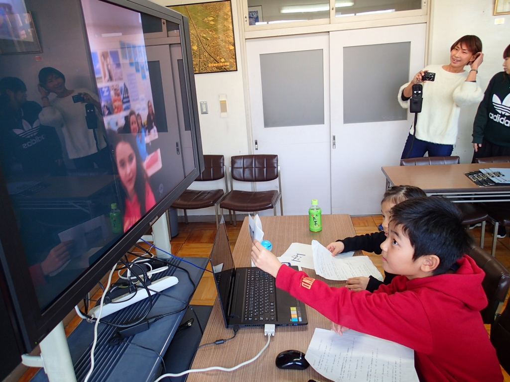 1月20日(土)午前、甚目寺西小学校相談室において、マロニー小学校(アメリカコネチカット州)との交流会が行われました。