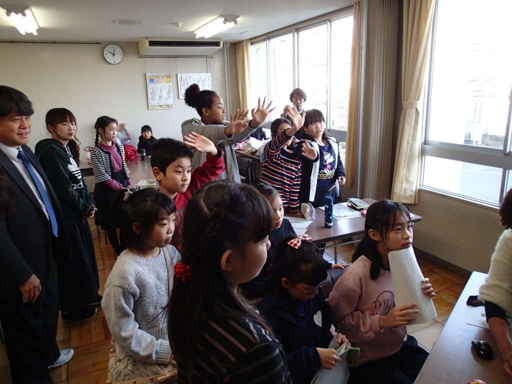 甚目寺西小学校4年・5年・6年の児童13名が、5つのグループに分かれ、マロニー小学校の児童にクイズを出しました。また、マロニー小学校の児童から出された質問には、とまどいながらも笑顔で答えることができました。