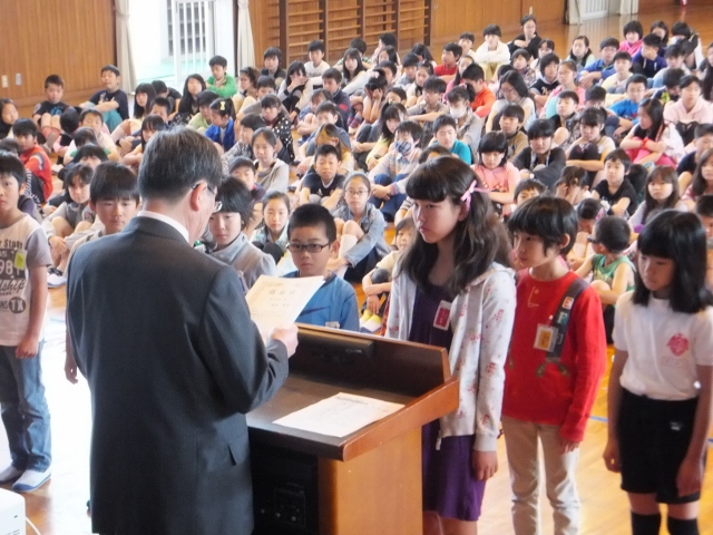 黄金週間が目前に迫り、ようやく天気も安定し、暖かくなってきました。この日の朝礼では、1学期の学級委員が認証されました。1年生は2学期から学級委員を選出しますので、2年生以上の学級委員10名が認証されましたが、皆、引き締まった表情でやる気が満ちあふれていました。
