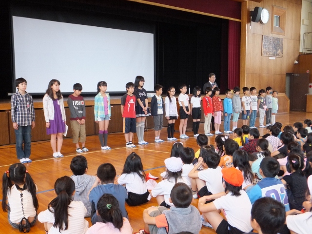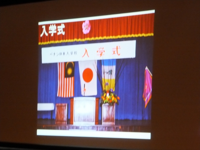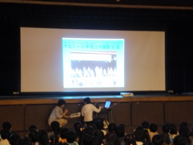 朝礼に引き続き、国際交流活動の紹介があり、これまでのマロニー小学校との交流の足跡と今後の交流の予定、さらには、世界に目を向けてほしいとの願いから、マレーシアのペナン日本人学校で勤務経験がある先生から、マレーシアの紹介もありました。