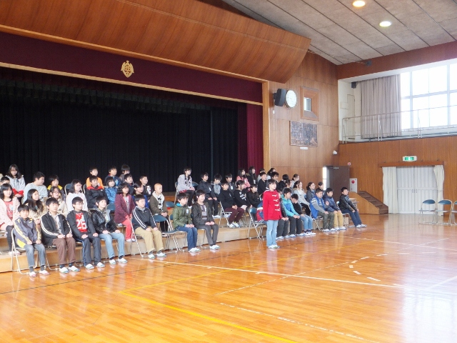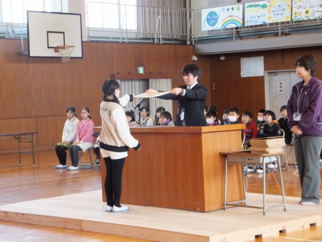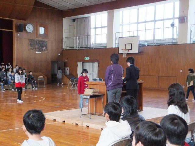 卒業式を前にして、一足先に6年生の修了式を行いました。代表児童が修了証を受け取り、修了式が無事済んだところで、養護教諭から成長の記録のプレゼントがありました。成長の記録カードは、身長が6年間で伸びた分と同じ長さのリボンが結んであり、ほどいてみると、予想以上の長さでびっくり!大きくなったんだね。