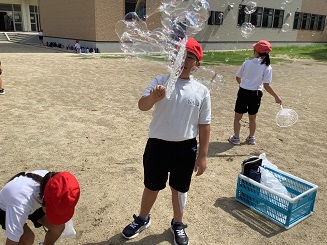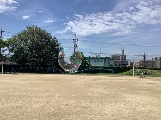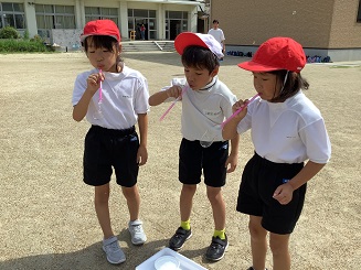 長い梅雨による悪天候のため、延期を繰り返した生活科の学習「夏の遊びを楽しもう」を本日実施しました。子ども達は運動場を広く使い、ストローやペットボトルを用いてシャボン玉遊びを行いました。シャボン玉を飛ばすことを大いに楽しみ、日に照らされながら宙を舞うシャボン玉を輝く瞳で見つめていました。
