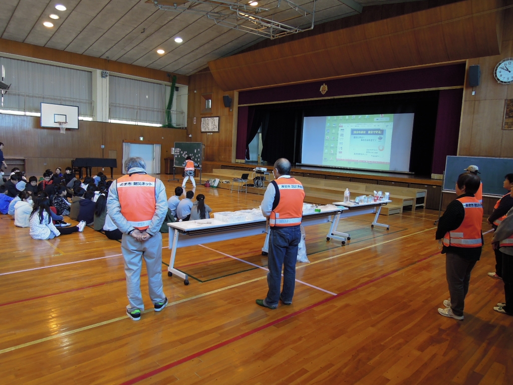 「あま防災ネット」の方15名に来ていただき、「避難所運営ゲーム」や「新聞紙スリッパ作り」、そして「紙芝居」など、学年に応じた内容で授業をしていただきました。