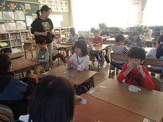 お隣の学級は、くり上がりのあるたし算の練習中でした。となり同士で机をくっつけて、交代で問題を出し合っていました。正解すると、答えた子も問題を出した子も笑顔になりました。