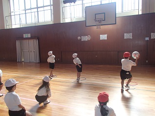 体育館では、ボール投げを練習していました。足の運び方や肩を使った投げ方を意識しながら、壁に貼った的をねらって投げます。「待つ姿が100点だね」と友達が褒められると、みんなが一斉にぴし!と良い姿勢をしました。投げるのも待つのも上達しました。