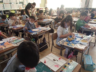 この学級では、紙ねん土の作品に絵の具で色をつけていました。ついこの間、絵の具の使い方を練習していた子どもたちですが、作品を持ち上げたり横から見たりして確認しながら、丁寧に色を塗っていました。