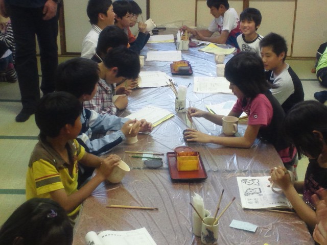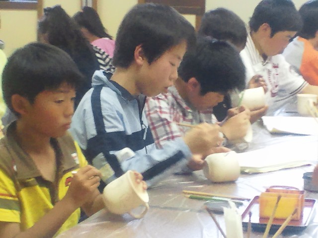 体調を崩す子もなく予定通り本能寺会館着。さっそく伝統工芸の清水焼絵付け体験、みんな真剣な顔付きです。