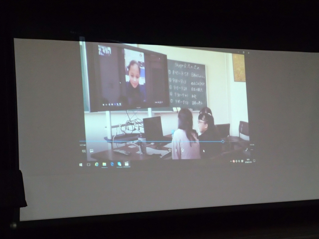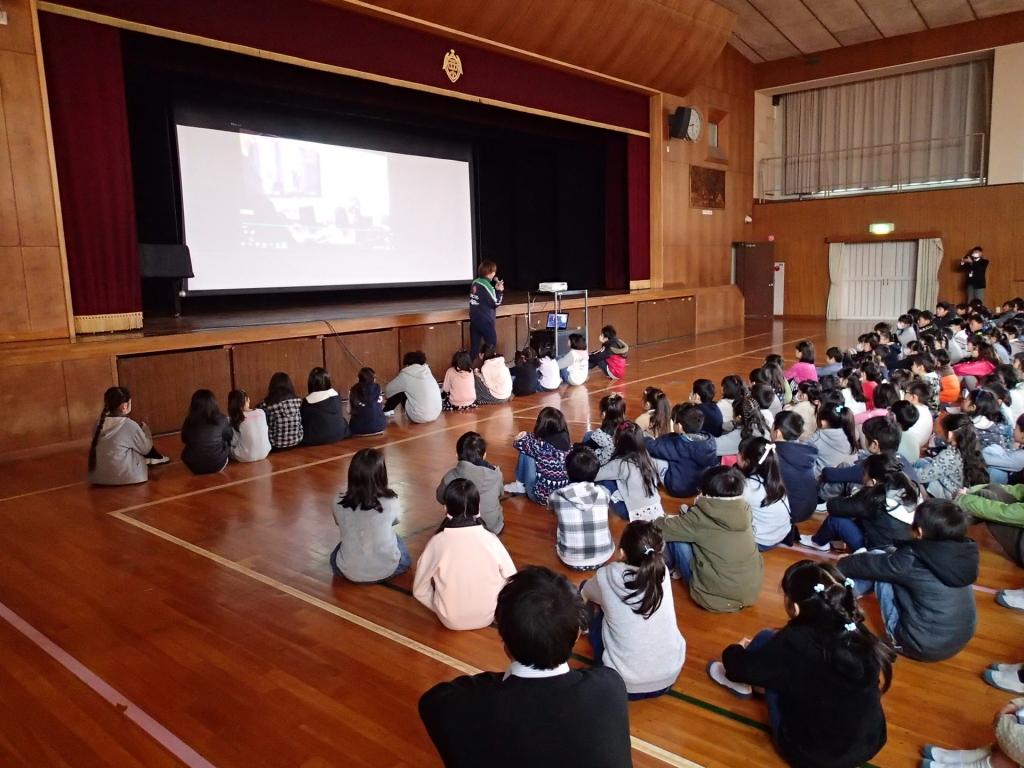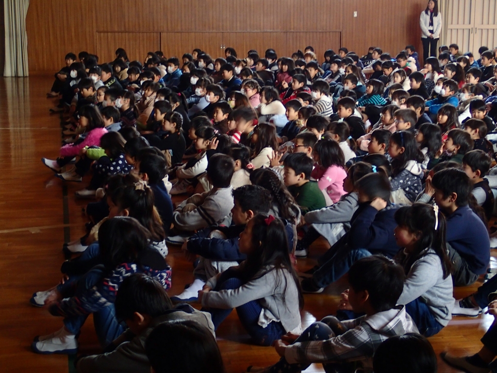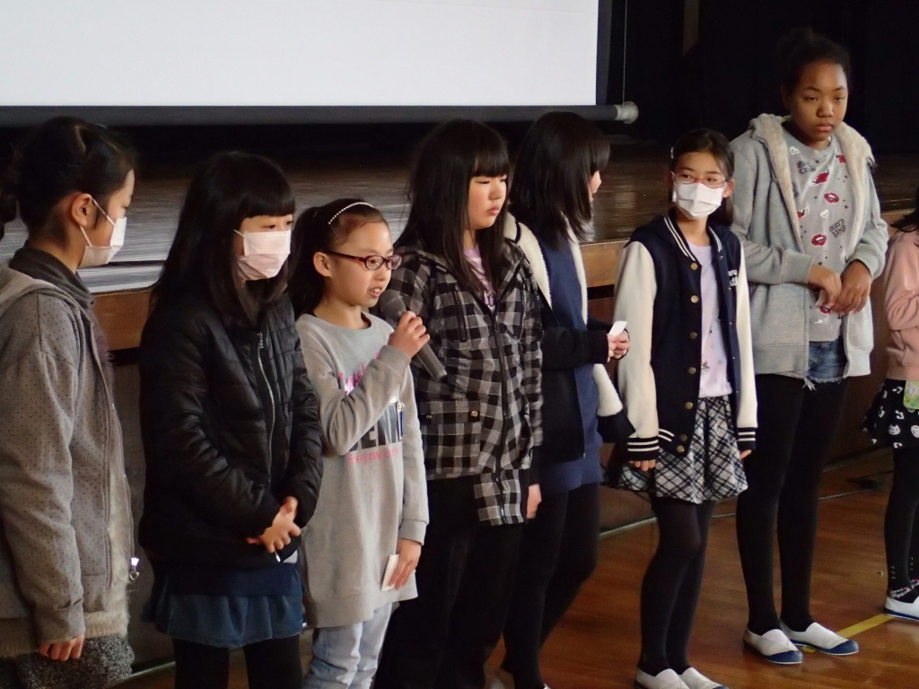 1月29日(月)体育館にて、「マロニー小学校との交流(20日実施)」についての報告会が行われました。