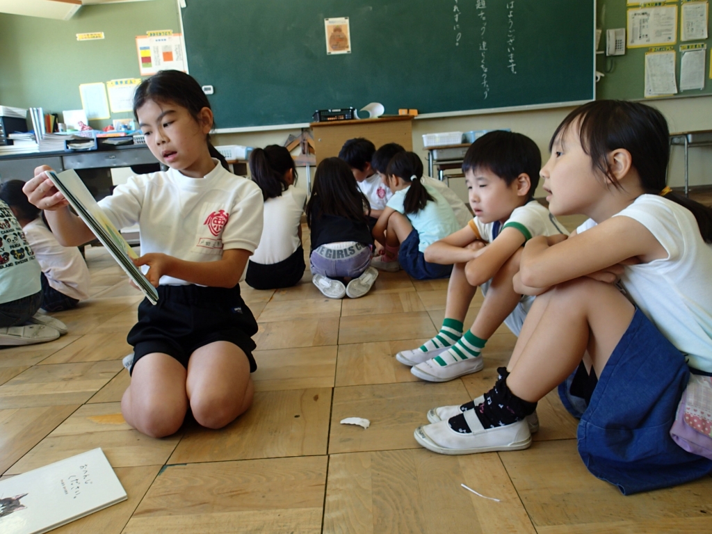 今日も、4年生が2年生に本を読み聞かせました。