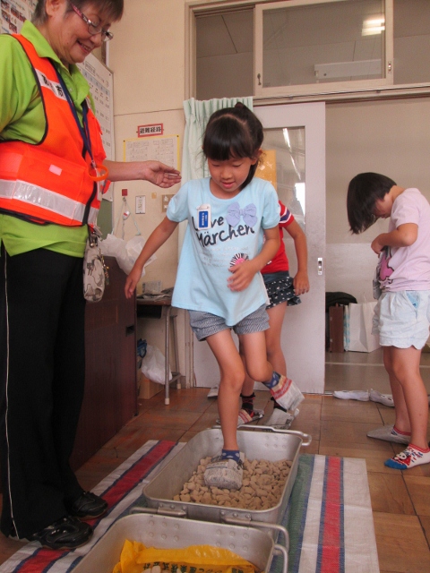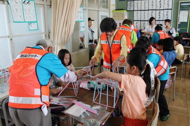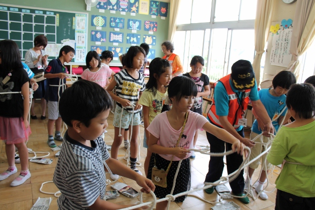 いつ襲ってくるかわからない大災害、備えあれば憂いなしとも言われます。この日は、地元の防災組織『あま市防災ネット』の皆さんを講師に招き、防災に関する知識・技能を学ぶ場を設定しました。毛布担架を作ってけが人を運ぶ訓練をしたり、ストローはウスを使って耐震構造について学んだり、ロープワークや簡易のスリッパづくりを学んだりしました。