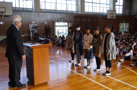 10月29日(月)の朝礼で、児童会役員と学級委員の認証が行われました。
