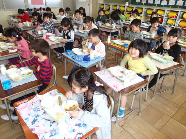 1年生は、初めての給食でした。先生から配膳の方法や食べ方の約束を聞き、一つ一つ丁寧に進めました。