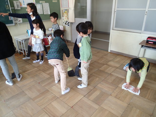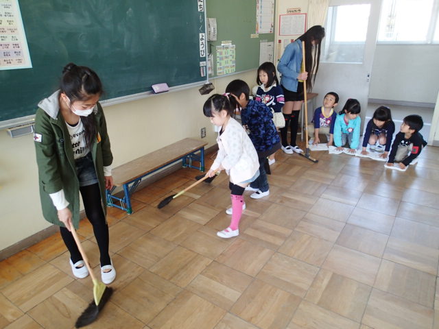掃除も初めて行いました。6年生が掃除のやり方を説明したりやって見せたりしながら行いました。まだ、ほうきやぞうきんの使い方はややぎこちないですが、教えてもらったとおりに一生懸命やろうという気持ちが伝わってきました。