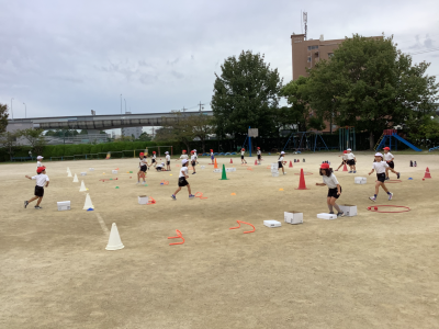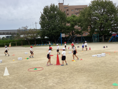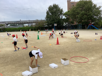 体育科では、班の友達と協力して、好きなコースを作り、そのコースで楽しく遊んでいます。「コーンは1回まわる」、「ボールを入れないと進めない箱」、「小さいコーンの間はケンケンパ」など、子どもたちの豊かな発想力が見られました。