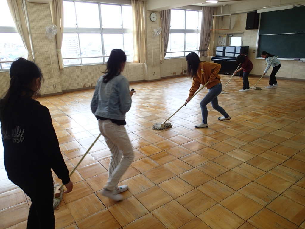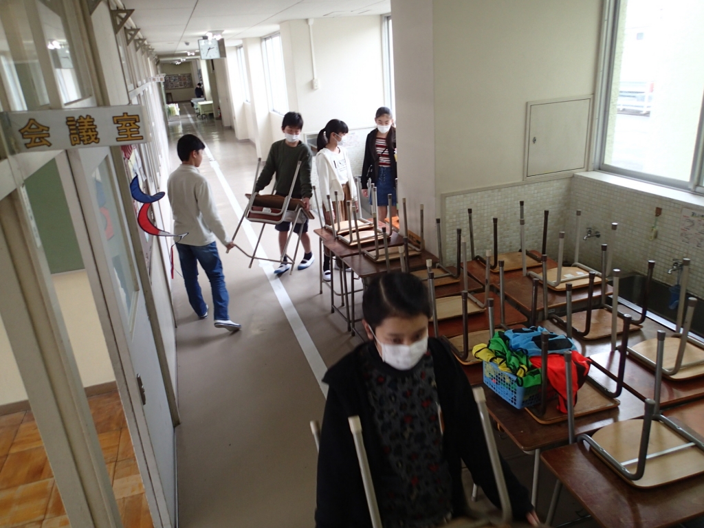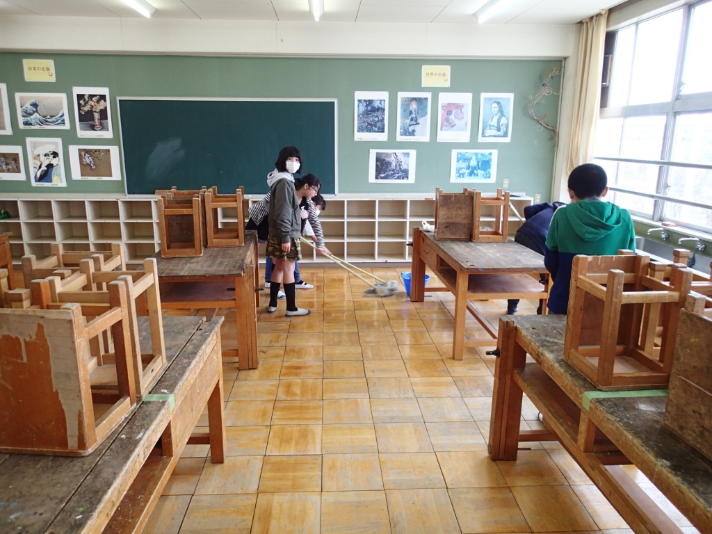 教室の机いすを全て廊下に出し、掃き掃除でごみを取り、ワックスを塗りました。