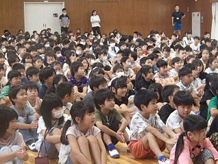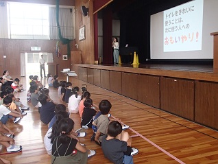 朝礼の後半には、トイレの使い方についてのお話を聞きました。昨年度新しくなったトイレですが、今年に入っていたずらや雑な使い方が見られるようになりました。ペーパーが散らかった床の写真や、芯を抜かれたペーパーの写真を見て、驚きの声があがりました。「みんなのトイレだから、大切に使おうね」という先生の呼びかけを、真剣な表情で聴く姿が見られました。