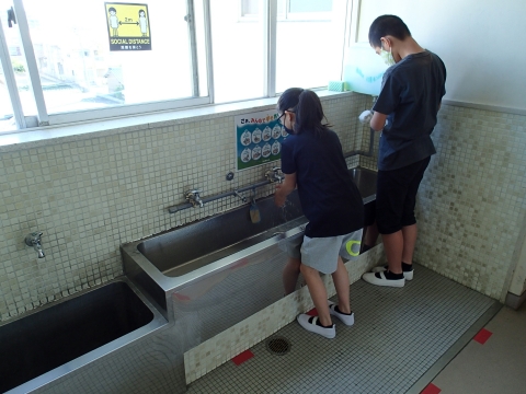 朝、登校すると手を洗います。