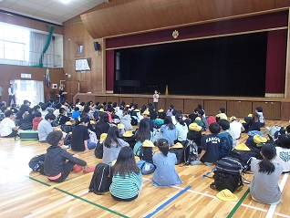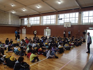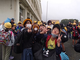 10月4日(金)、待ちに待った5年生の野外活動の日です。集合時間よりも早い時刻に、5年生が次々と登校しました。雨のため、体育館での出発式です。