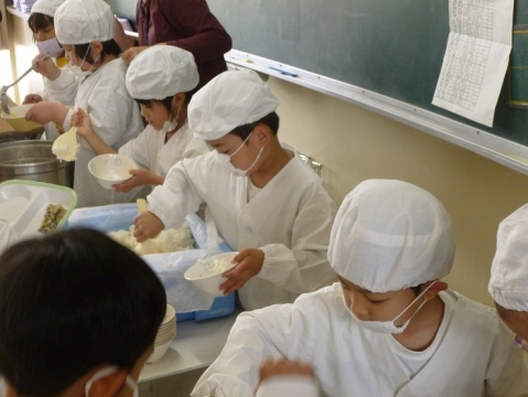6年生の各教室では、ケーキのじゃんけんで盛り上がるところ、全員で輪になって食べるところ、思い思いに給食の時間を楽しみました。