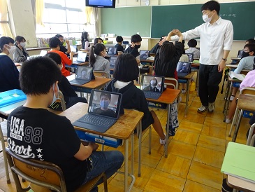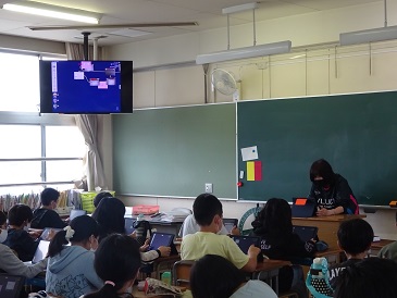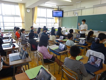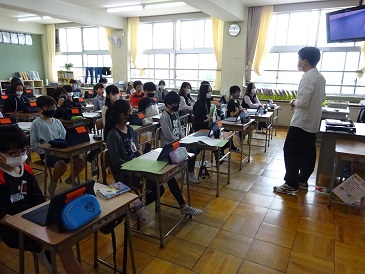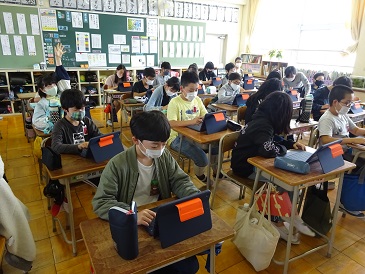 「ロイロノート」というクラウドを使用し、作成した文章をオンラインで提出する方法を学びました。初めてのiPadの利用に、どの子もしっかりと話を聞き、意欲的に活動に取り組みました。