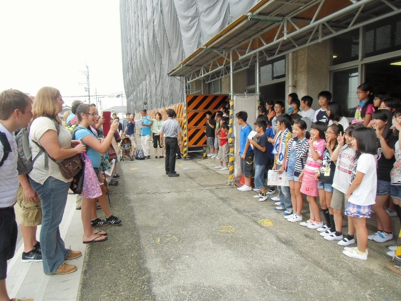 6年生が代表してお見送り          児童会長からお別れのメッセージ         名残を惜しむ両校の子どもたち