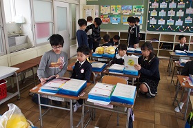 6年生の各教室では、ケーキのじゃんけんで盛り上がるところ、全員で輪になって食べるところ、思い思いに給食の時間を楽しみました。