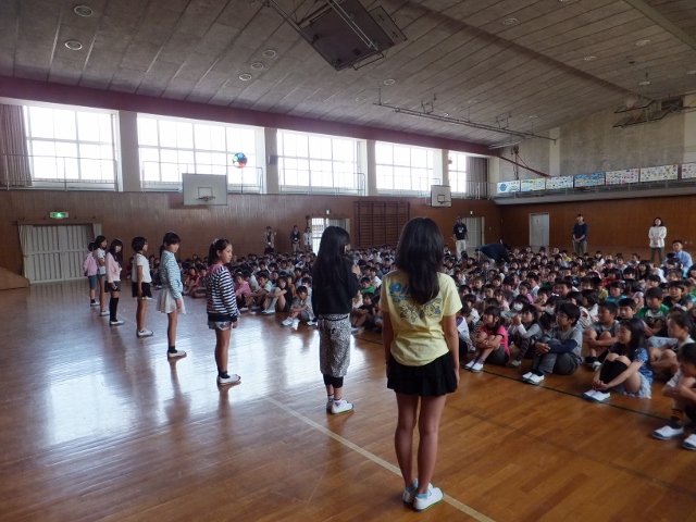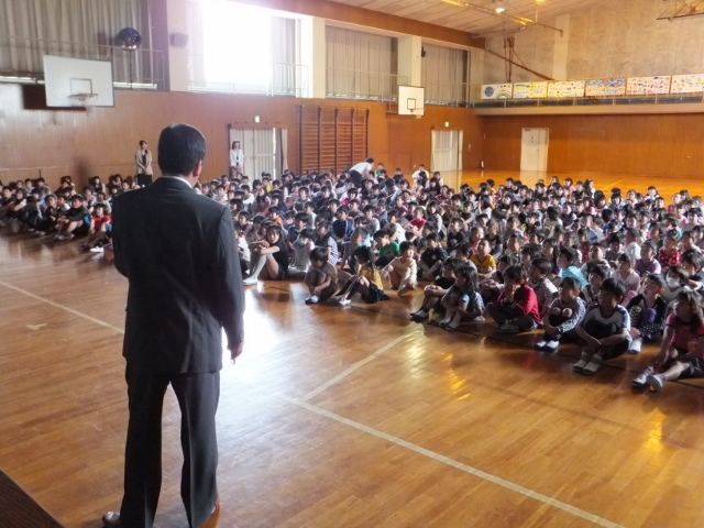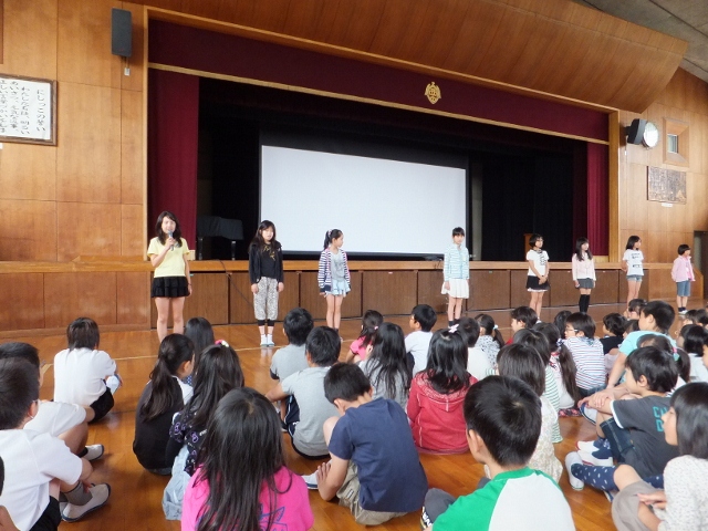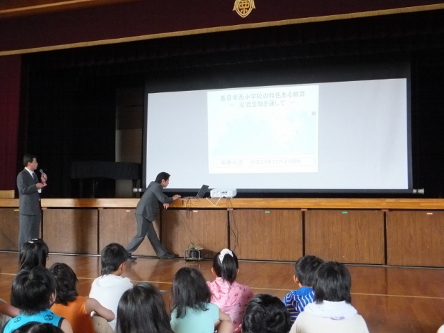 6年生が修学旅行から戻り、久しぶりに全校児童が一堂に会して、朝礼が行われました。この日は、まず、校長先生から、7月に来日予定のアメリカ合衆国のマロニー小学校について、スライドを見せながら、紹介がありました。ホームステイをしていただく計画もあり、交流を楽しみにしている子も多く、皆、目を輝かせて、説明に聞き入っていました。