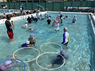 今週の授業は、プールの隅を歩いたり、アヒルやカニのまねをして、口まで水をつけたり、水に慣れるような内容でした。特に、浮かんでいる青と白のフラフープを交互に潜ってくぐる遊びは、とても盛り上がりました。