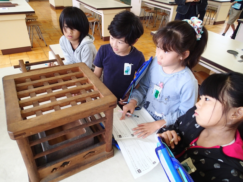 「おかま」や「置きごたつ」そして「そろばん」など、昔使われていた道具を見たり触れたりして、ワークシートの問いに答えていきました。