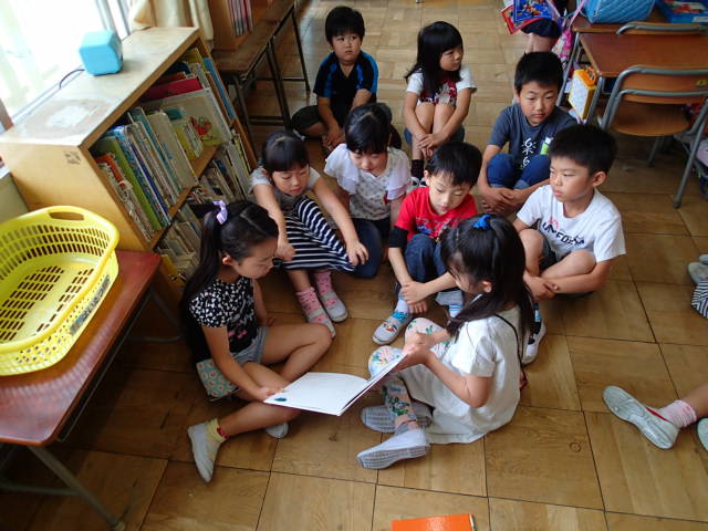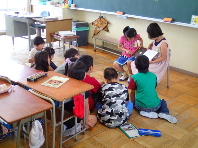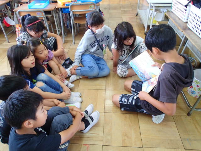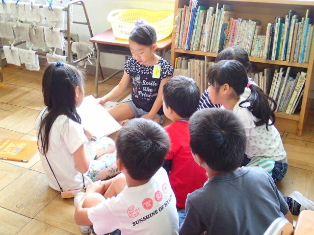 今回は、4年生が2年生に読み聞かせを行いました。 4年生は、一生懸命本を支えながら読んでいました。