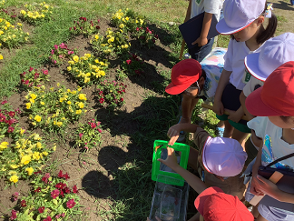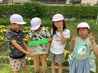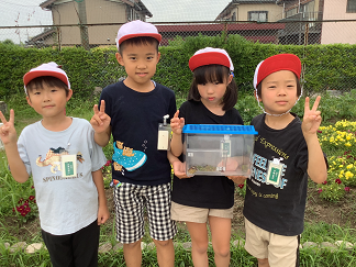 各クラスで育てている幼虫が、さなぎから蝶に成長し、みんなでお別れをしました。1組はすべての幼虫が蝶になり、記念撮影をして、思い出に残しました。2組は育てている最中なので、みんなでまだ成長を見守っています。