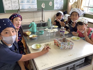 家庭科の時間に、ゆで野菜サラダを作りました。今回は包丁も使い、野菜を切ったりゆでたりしました。調理が終わった後は、そのままで食べたり、塩コショウで食べたり、フレンチドレッシングを作って食べたりしました。とってもおいしかったようです。ぜひおうちでも作ってほしいなと思います。
