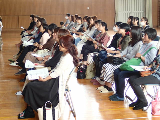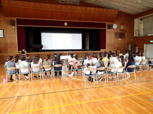 始めに体育館で、甚目寺給食センター栄養士増田先生による講義「学校給食について・朝食の大切さ」が行われました。栄養についての話や給食センター内の様子、そして朝ご飯と学習との関係について話がありました。その中で、愛知県は野菜の摂取量が少ないこと、五千人分の給食がいかに安全に作られているのか、学力が高い子は欠かさず朝食を食べていることがわかりました。