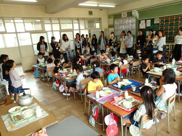 その後、1年生の教室へ移動し、配膳・片付け・歯磨き指導の様子を見たり、試食をしていただいたりしました。