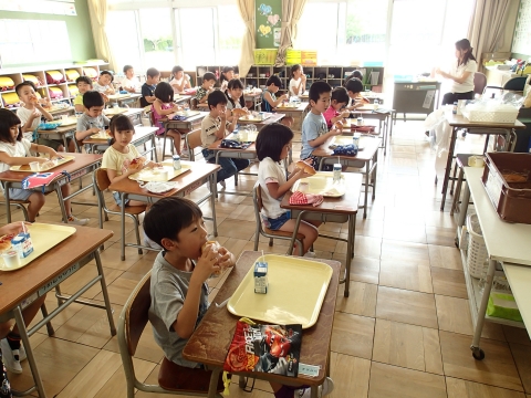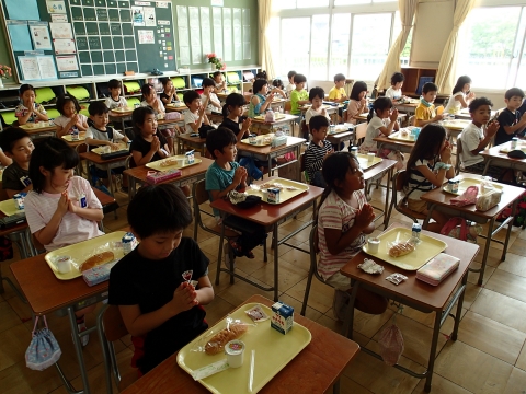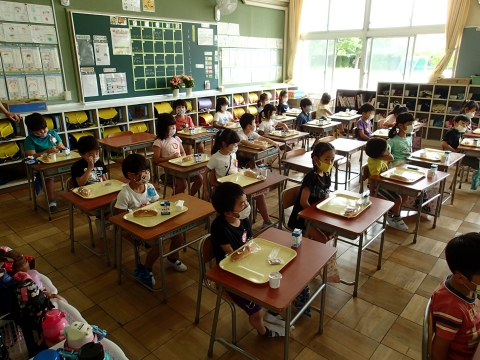 先生から配膳や片付けの仕方を聞き、「いただきます」をして食べました。