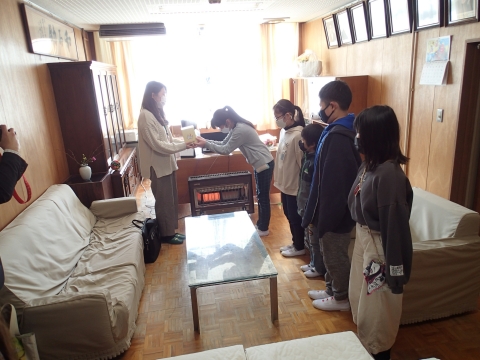 児童会長が「大切に使ってください」と伝えると、社会福祉協議会の方は「大切に使わせていただきます」とおっしゃって受け取られました。