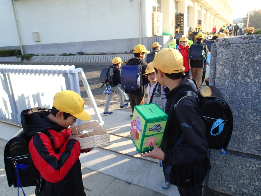 児童会役員が自分たちで用意した募金箱を手に、