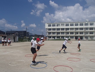 5年生は幅跳びに向けて、基礎トレーニングを重ねていました。暑さの中に、ときおり涼しい風が吹きます。「去年より記録上がるかなあ」というつぶやきが聞こえました。