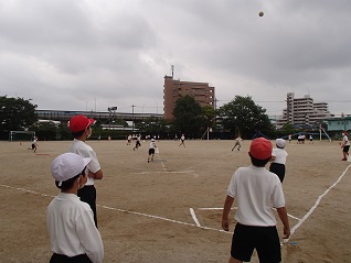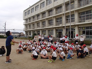 運動場で活動していたのは、屋外運動クラブ。チームに分かれてキックベースを楽しんでいました。先生の説明を聞いたら活動開始。「1班こっち~」と招集したり、「ボール転がしてみたい人いる?」と役割を与えているのは6年生。てきぱきした指示はさすが最高学年です。