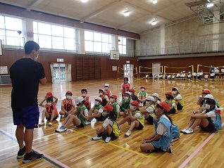 体育館でお話を聞いていたのは室内運動クラブ。今回はバスケットボールです。先生のシュートが入ると「おお・・・」と低い歓声がもれました。