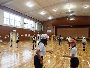 同じく室内ゲームクラブ。こちらのチームはバドミントンをしています。ダブルスは学年の違う相手と組みます。緊張しながらお互いに自己紹介をしました。