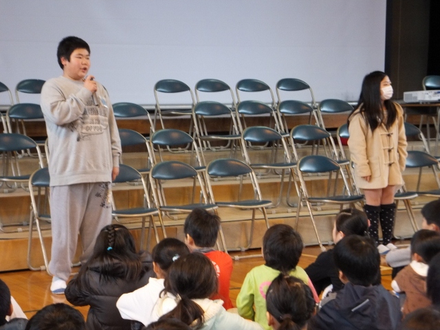 朝礼の後は、児童集会として、1年間の委員会活動をふり返る会を開きました。この日は、放送・図書・保健・運動委員会の委員長が、成果と課題を交え、次年度へつなげてほしいことについて語ってくれました。